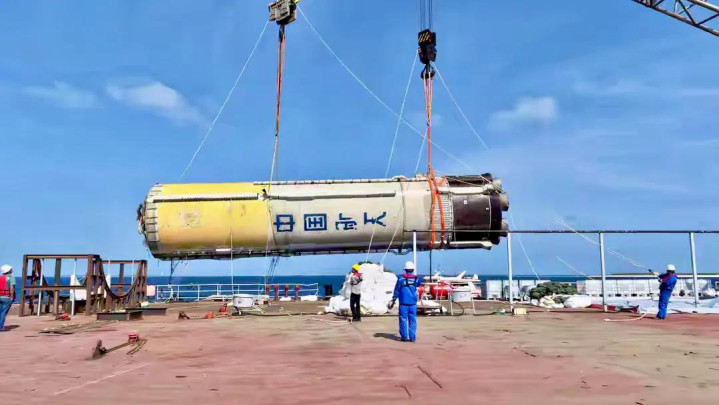 气囊抬升完成后,打捞船的起重机缓缓启动,操作主谈主员通过精确操控,将吊索稳重挂在箭体的专用吊点上,通盘过程要保持统统稳重,幸免吊索浪荡撞击箭体。