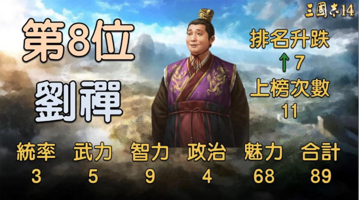 扶不起的阿斗历来齐是这个系列中最废的东谈主物之一,但比较上一代如故高涨了7名的,在《三国志14》里排到了倒数第八。他的统治3、武力5、智商9、政事4、魔力68,共计89。前四项全是个位数,好意思满证实了啥叫除了转世啥也不会,也就68的魔力还能看,毕竟是蜀汉正宗天子,瘦死的骆驼比马大。可惜这魔力在游戏里也就只可当个祥瑞物,念念靠他治国往来?纯熟念念多了,就这数值探求连长坂坡的草齐打不外。