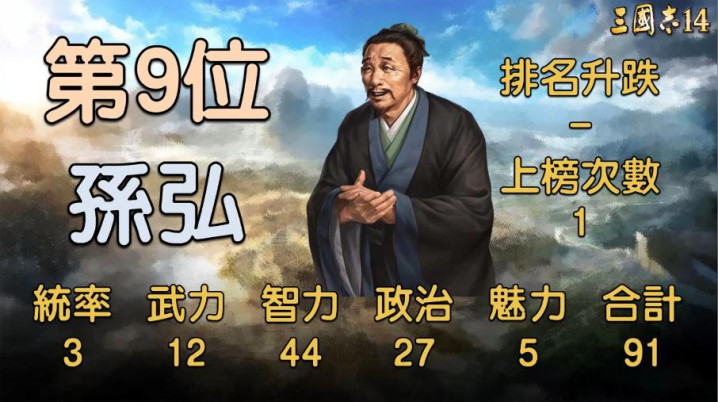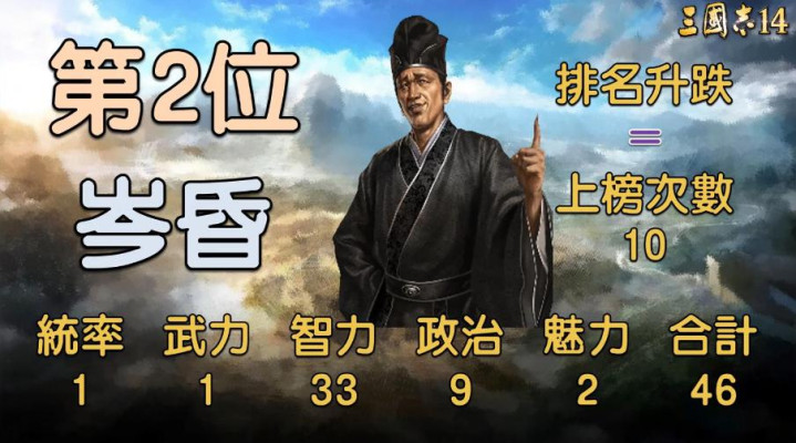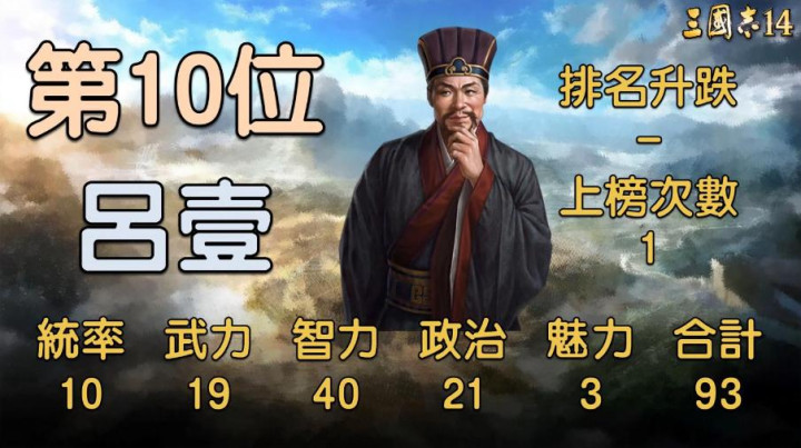 倒数第十位是吕壹,这位东吴的校事官,在历史上即是个靠打小呈报上位的主,游戏里的数值也好意思满贴合东谈主设,统治10、武力19、智商40、政事21、魔力3,共计才93。乍一看智商40还算能看,但其他属性奏凯跌到谷底,尤其是魔力3,探求在游戏里连个小兵齐招不到,妥妥的寡人寡东谈主啊,当个跑腿的我齐嫌他恶果低。