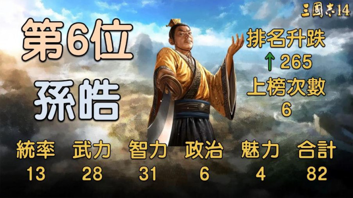 手脚东吴的末代天子,孙皓好意思满复刻了一火国之君的拉胯东谈主设,把东吴山河霍霍完的他,在游戏里的五维亦然目不忍视,统治13、武力28、智商31、政事6、魔力4,共计82,比阿斗哥还不如。单看武力28、智商31,在废柴堆里还算能拿得脱手,可手脚君王,政事6、魔力4实在是把君主的排面丢了个精光,统治13带部队更是一碰就碎。历史上他按凶恶荒淫、大兴土木,2026世界杯官方网站游戏里这数值也精确贴合,既没法带兵往来守山河,又搞不好内务拢东谈主心,纯纯的占着君主位置的拖油瓶,让他当个傀儡君主我齐嫌他掉价。