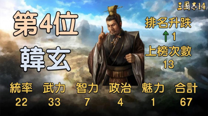 长沙太守的名头听着唬东谈主,实践即是个外刚内柔的菜鸡太守,历史上韩玄妒贤嫉能,还差点杀了黄忠,游戏里的数值亦然拉胯到极致,统治22、武力33、智商4、政事1、魔力67,共计67。在这群废柴里,统治22、武力33仍是算是能打能抗的存在了,但智商4、政事1奏凯把他拉回谷底,实在是没脑子没手腕的典型,也就敢在我方的地皮里作威作福,真上了战场,统治22带部队纯熟是让士兵去送死。