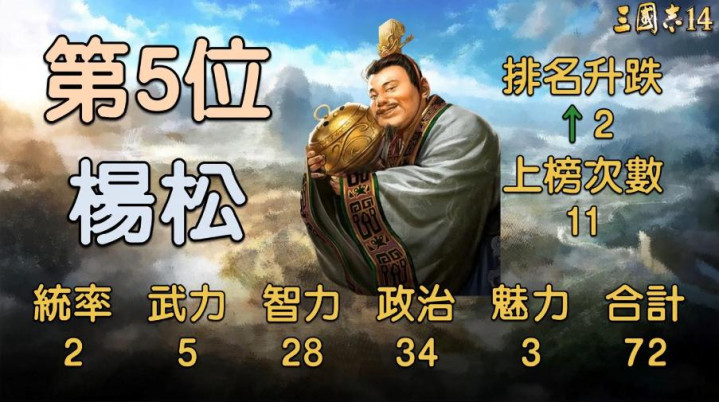 这位张鲁部下的谋士,号称三国里贪财忘义的代名词,为了财帛连主公齐能出卖,游戏里的数值也把这一秉性展现得大书特书,统治2、武力5、智商28、政事3、魔力72,共计72。好家伙,魔力72比刘禅还高,探求是应用主公、贪小低廉的功夫一流,可惜智商28连个最浅易的计略齐放不出来,统治2更是连城门齐守不住,政事3连账齐算不解白,也就靠一张嘴混饭吃。一般小编捏到他基本齐是奏凯砍掉,留着齐怕他被敌军收买,反手坑我方一把。