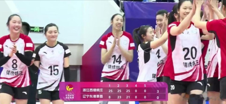 21比18,22比19。浙江女排胜利在望。浙江女排失误22比20,浙江女排二传二次球得分23比20,打探头球得分24比20,辽宁女排进攻得分24毕21,14号季雨潇进攻得分,25比21,拿下赛点,从而第回合中,主场3比0战胜辽宁女排,如此,在2025-2026赛季中国女子排球超级联赛 赛中升降赛第二回合,浙江西塘姚庄主场3-0战胜辽宁东港草莓(25比8、25比23、25比21),昂首挺胸升入女排A级联赛。