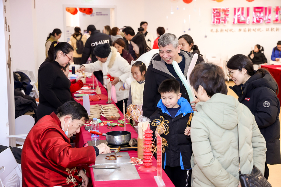 一旁的广场上,康桥有喜“市”积聚东谈主气,成为一派欢腾的海洋。“康桥万家福”心愿墙前,住户们争相吊挂写满祝福的卡片,共同织就一幅顺心的社区祈愿图景。非遗体验区里,糖画艺东谈主以糖为墨,手腕流转间勾画出灵动的生肖图案,招引孩子们目不转视;剪纸巧手红纸翻飞,倏得剪出空闲纹样;书道台前墨香四溢,书道家协会的淳厚挥毫泼墨,一副副饱含祝愿的对子和“福”字被住户欢腾地接过,一旁的“全球书写台”也招引不少住户一试本事,体验翰墨之趣。