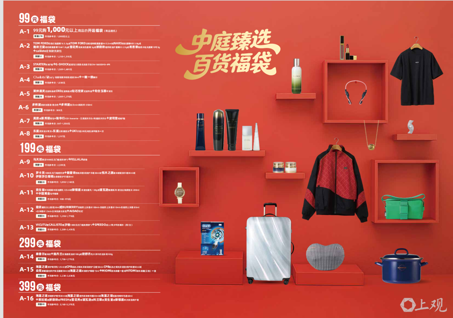 其中,食物餐饮福袋还是热点,99元档位即可解锁多重惊喜,涵盖果栗园200元提货券、小罐茶匠心系列、奇华点心套餐、Ole海陆年货套餐等,最高价值超400元;99元购千元的餐饮福袋号称“性价比之王”,每年皆“提前售罄”;299元福袋则涵盖海蓝之谜在内的外洋一线化妆品;高价位福袋则积攒更多优质好物,如699元可购买五粮液普五八代52度500ml+小金锤经典赤霞珠干红葡萄酒750ml*2,清翠不同奢侈群体的个性化需求。
