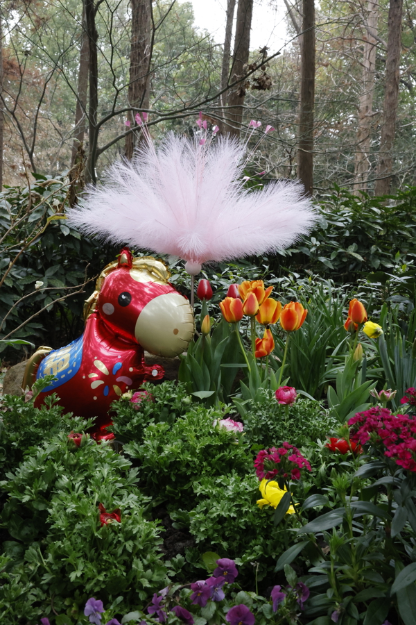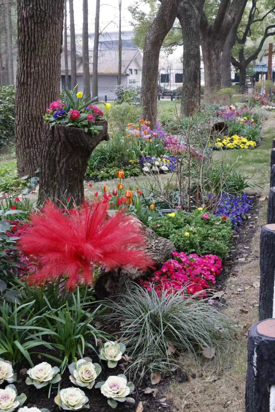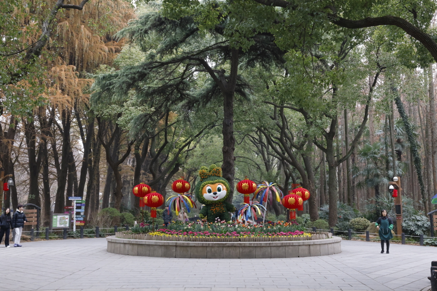 西门雪松树坛中,公园祥瑞物松鼠绿雕俏皮亮相,周围蜂拥着追究的水仙和优雅的造型女贞等耐寒植物,再点缀上颜色明丽的郁金香、石竹等,并吊挂起串串红灯笼,一会儿点亮了浓浓的年味。沿西门骨干说念前行,缤纷的节日花草和苍翠的耐寒植物、新春打卡框等变成“一步一景”的体验。