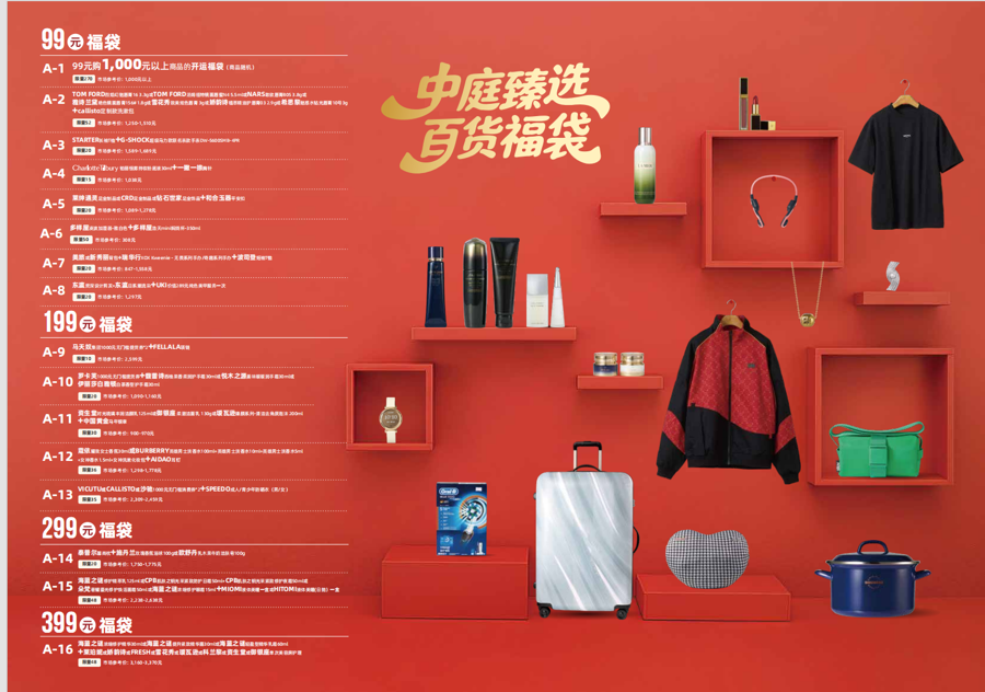 其中,食物餐饮福袋已经热点,99元档位即可解锁多重惊喜,涵盖果栗园200元提货券、小罐茶匠心系列、奇华点心套餐、Ole海陆年货套餐等,最高价值超400元;99元购千元的餐饮福袋号称“性价比之王”,每年王人“提前售罄”;299元福袋则涵盖海蓝之谜在内的海外一线化妆品;高价位福袋则汇注更多优质好物,比如699元可购买五粮液普五八代52度500ml+小金锤经典赤霞珠干红葡萄酒750ml*2,中意不同滥用群体的个性化需求。