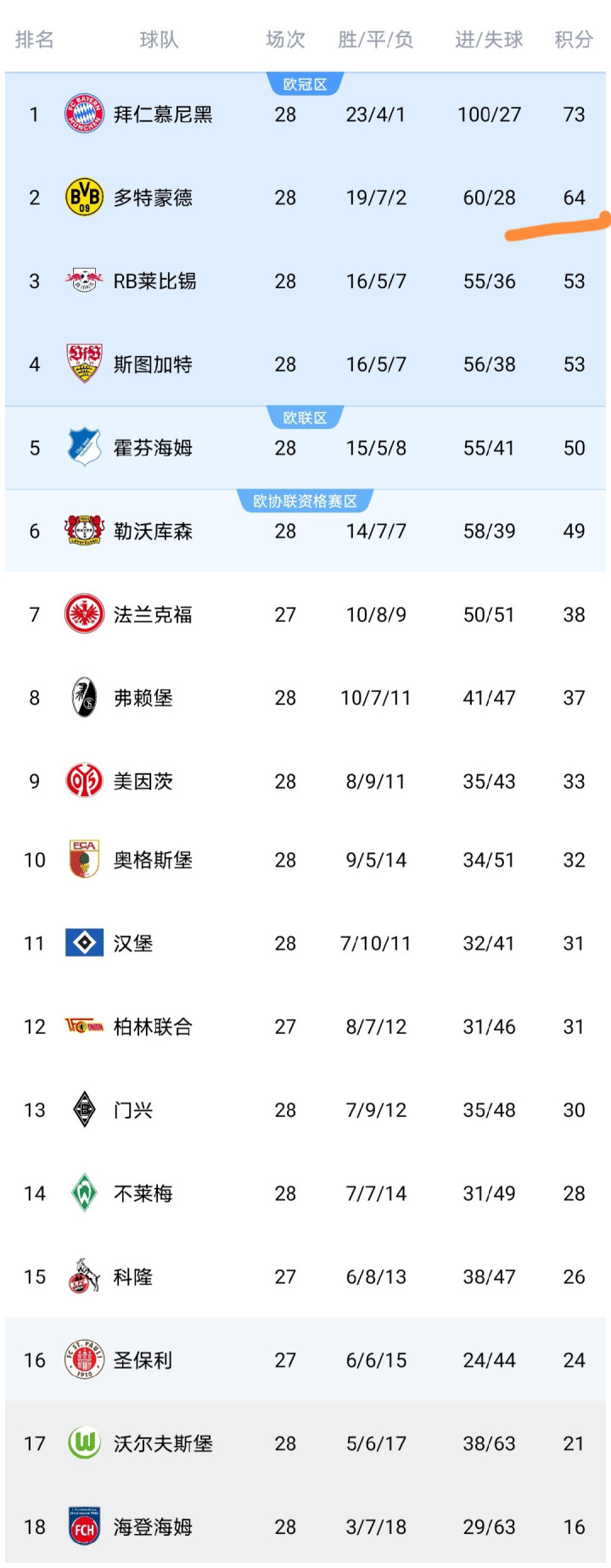 不错看到多特蒙德取胜之后,积分高潮到了64分,落伍榜首的拜仁9分。而斯图加特积分停留在53分,排行第4。
