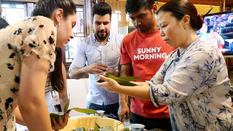 在上海青浦朱家角古镇,留学生学习粽子的制作手法。 新华社图